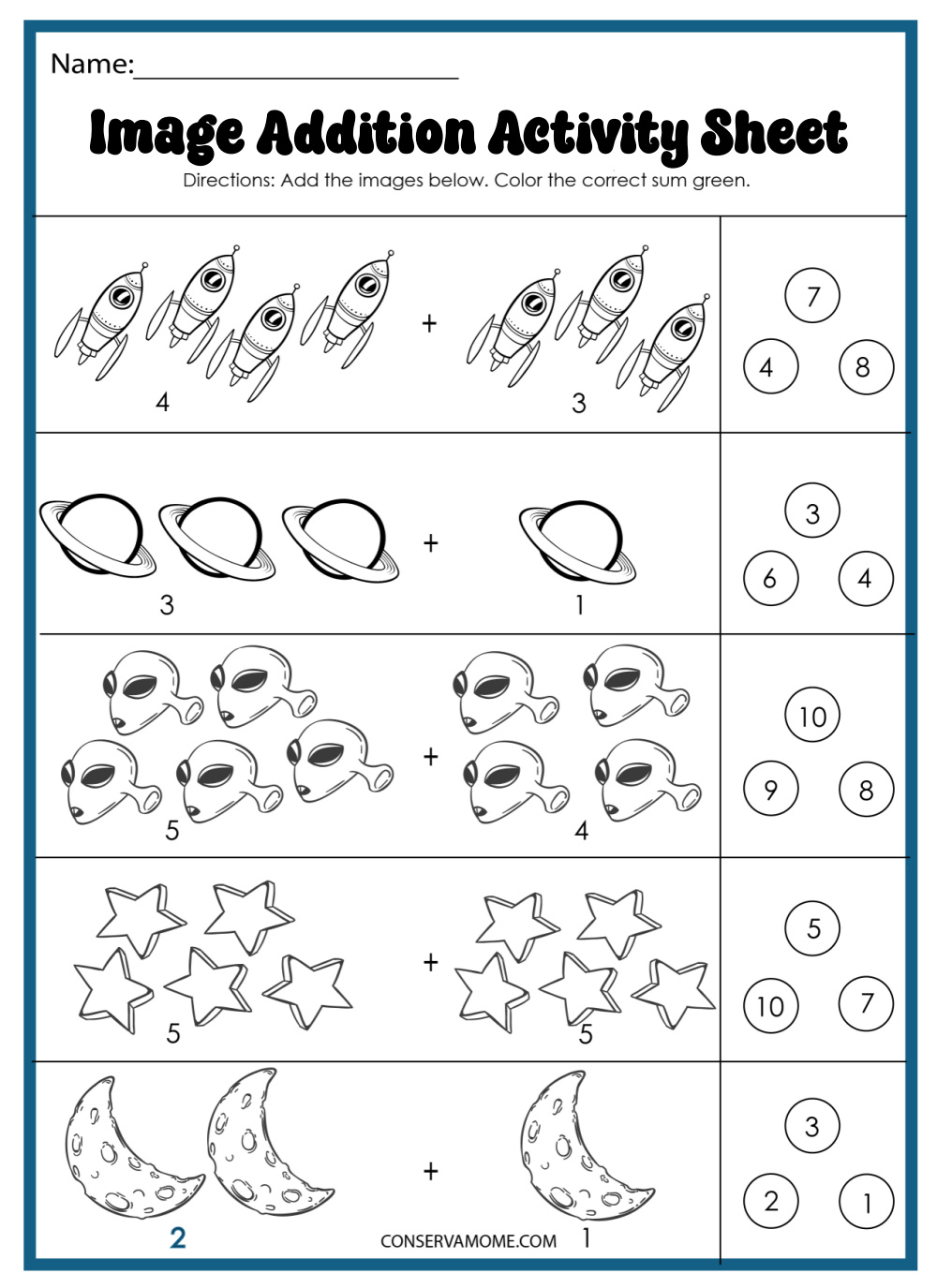 Space Addition Activity sheet– Early Addition practice using outer space fun!