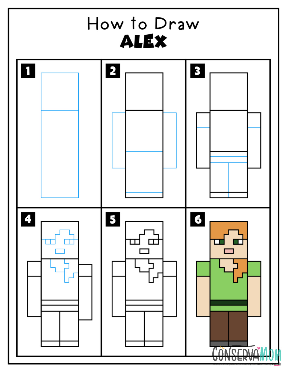 Each sheet breaks down the drawing process step-by-step to help kids (and grown-ups too!) draw their favorite Minecraft character like Steve, Alex, Creeper, Enderman, Skeleton, and more. Using basic blocks, these directed drawing pages make it easy for anyone to follow along—even if they’re brand new to drawing.